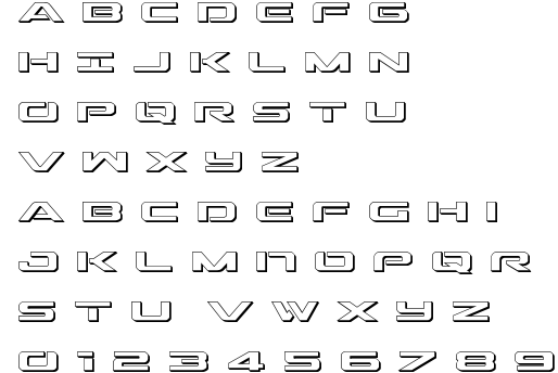 Outrider3D is most popular/used font in the State of USA. Project name of this font is Outrider3D. Personaly feel free to use 2011 Iconian Fonts - www.iconian.com but when you use this font commercially please contsct- 2011 Iconian Fonts - www.iconian.com.